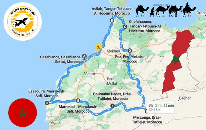 Mapa do Roteiro de 14 Dias em Marrocos